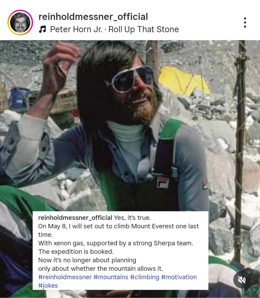 “Sì, è vero. L’8 maggio partirò per scalare l’Everest un’ultima volta. Con gas Xenon e il supporto di un forte team di Sherpa. La spedizione è prenotata. Ora non si tratta più di pianificare, ma di vedere se la montagna lo consentirà”. Questo l’annuncio con cui Messner ha deciso di mettersi in gioco. A rileggerlo a mente lucida un chiaro messaggio farlocco, grazie a quei dettagli in secondo piano: lo Xenon e gli Sherpa. Ma in fondo, a caldo, a quanti sarà capitato di fermarsi a bocca aperta alle prime parole e pensare “è arrivato il momento?”. Mentiremmo a noi stessi dichiarando di non aspettarci ancora qualche spedizione sugli Ottomila del Re, che nonostante l’età vedremmo ancora scattante verso la cima, magari proprio in quello stile puro che lo ha reso leggenda. E tra i commenti, c’è chi ammette con candore di averci sperato: “Ci stavo credendo, mitico!”.