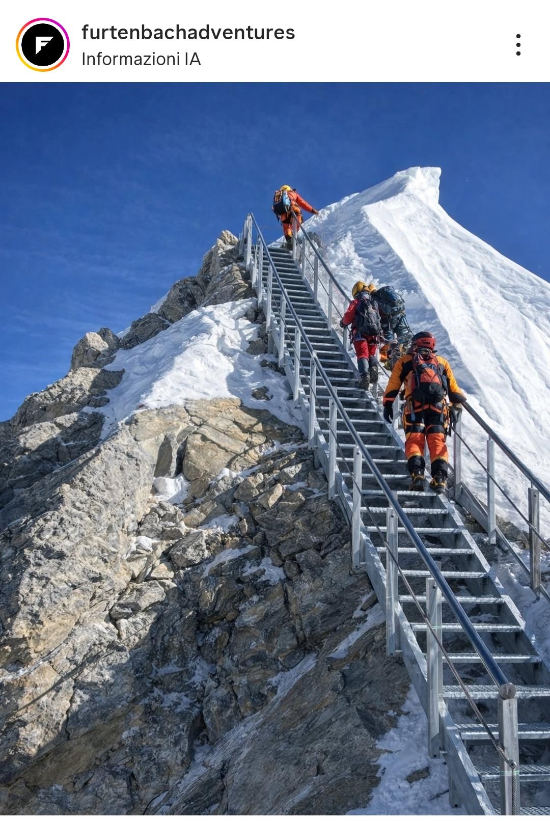 Furtenbach Adventures ha puntato su un classico intramontabile, che l’IA ha reso spaventosamente credibile. L’agenzia di viaggi di Innsbruck ha annunciato la realizzazione di una “infrastruttura” per superare il celebre collo di bottiglia dell’Hillary Step sull’Everest: una scala metallica zincata con tanto di corrimano di sicurezza. “Niente più code, solo una passeggiata panoramica verso la cima”.