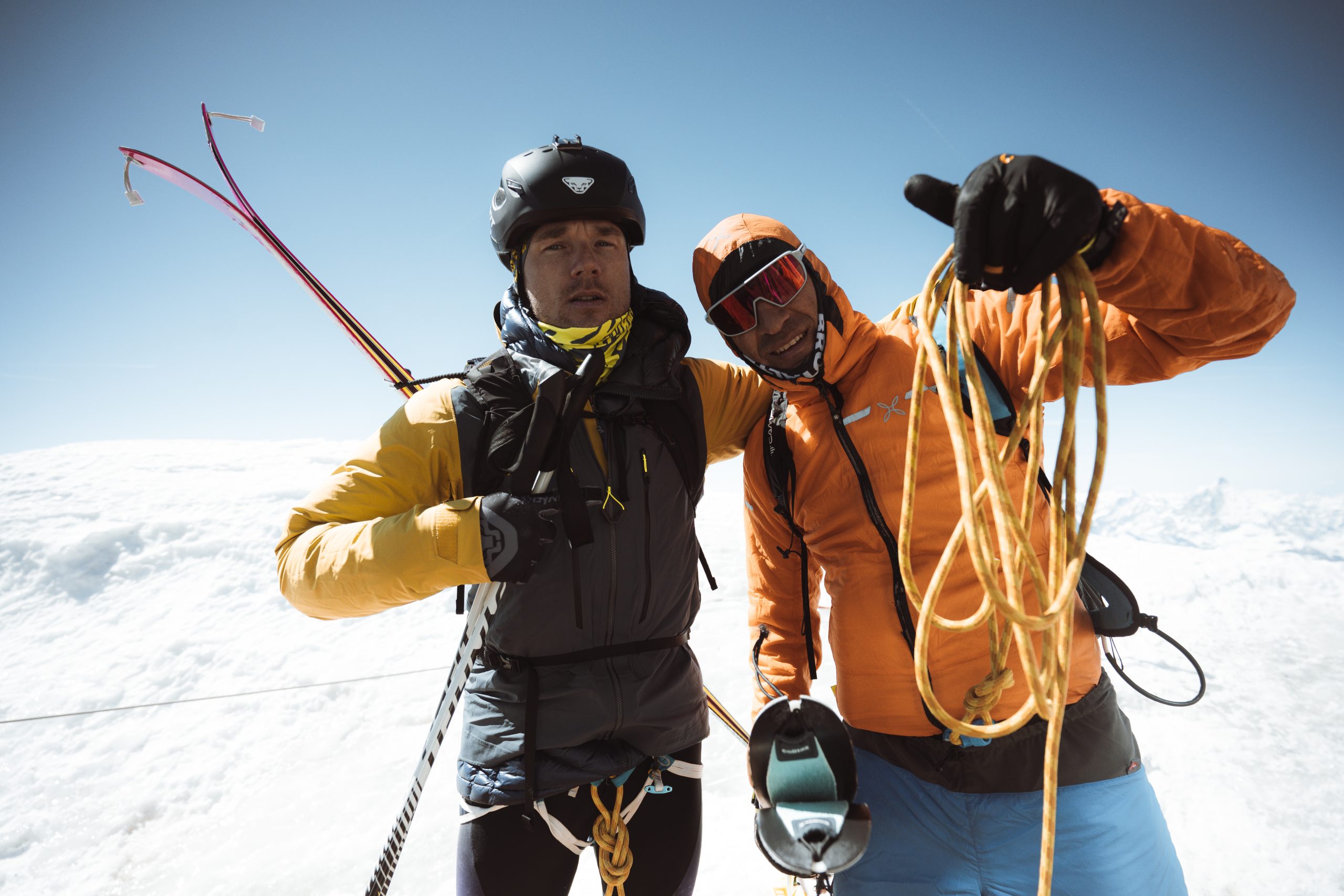 L’ultimo tratto è il più tecnico: ripido, esposto, affrontato con i ramponi. Una sezione preparata con attenzione anche dal team, parte del quale era salito in quota fin dalle prime ore del mattino per organizzare le riprese e garantire la sicurezza. Alle 13:10, dopo undici ore di sforzo continuo, Verdenal percorre in cordata con Collé la cresta finale e raggiunge la Capanna Margherita.