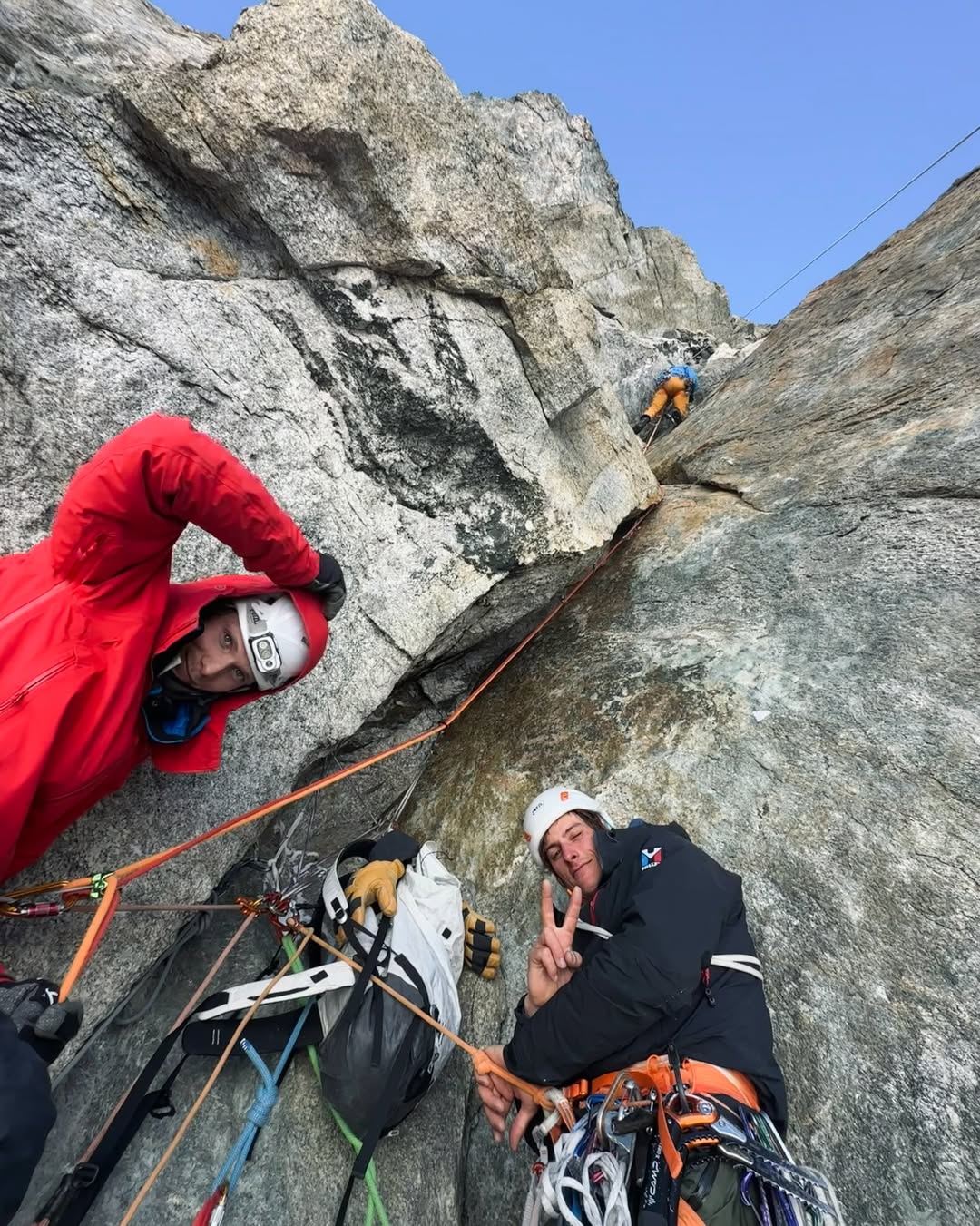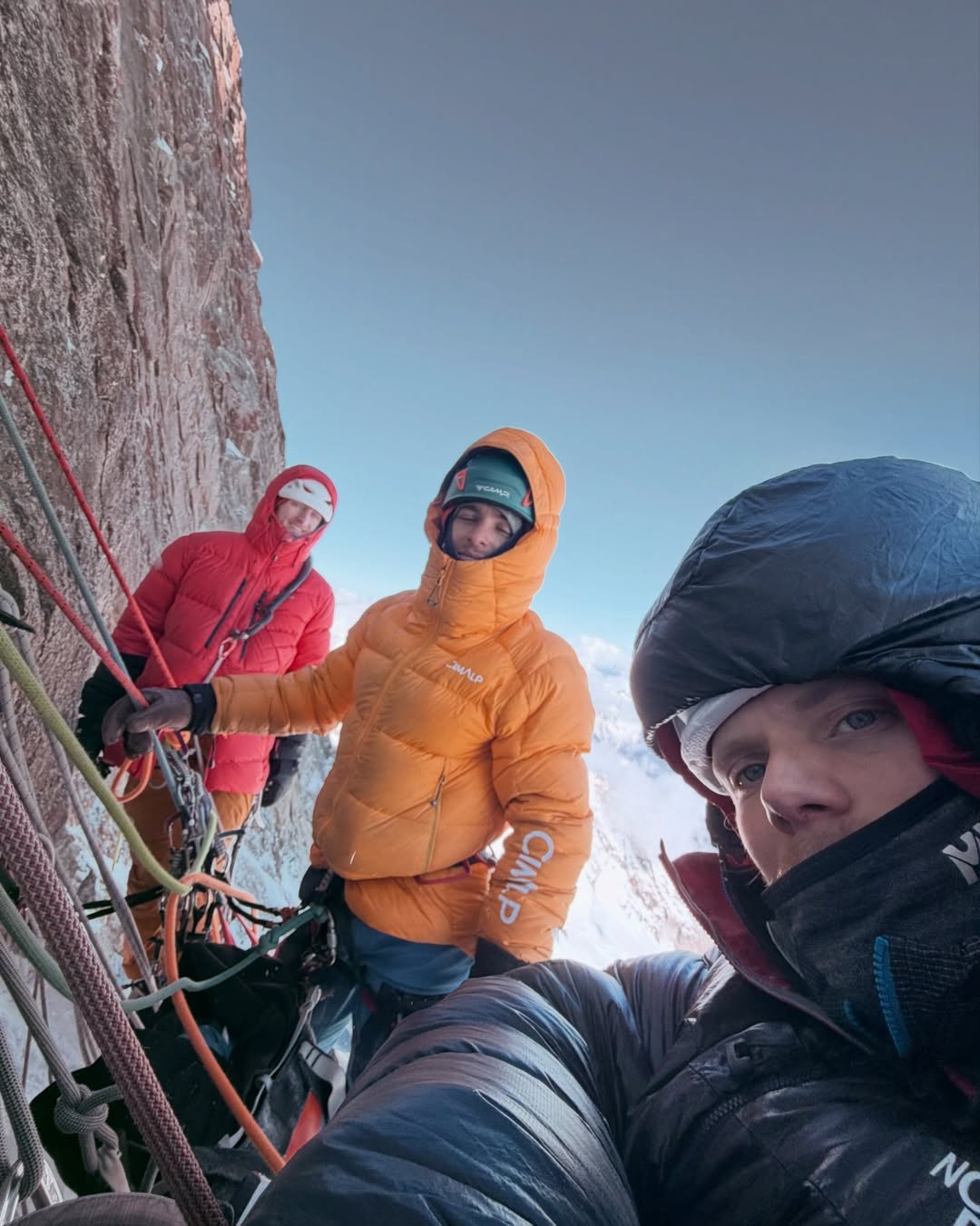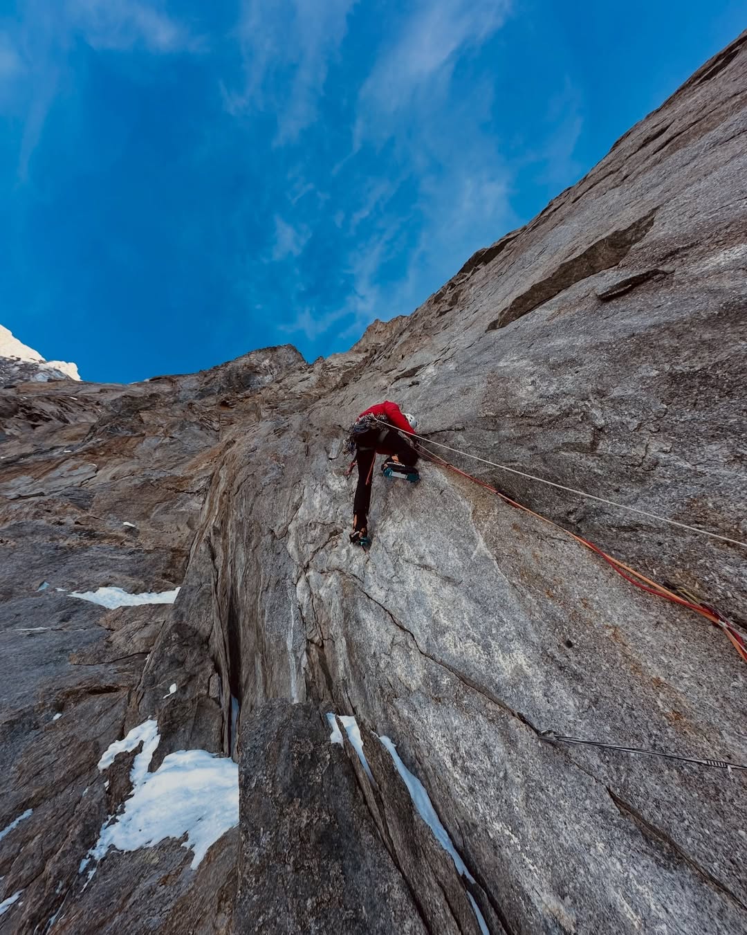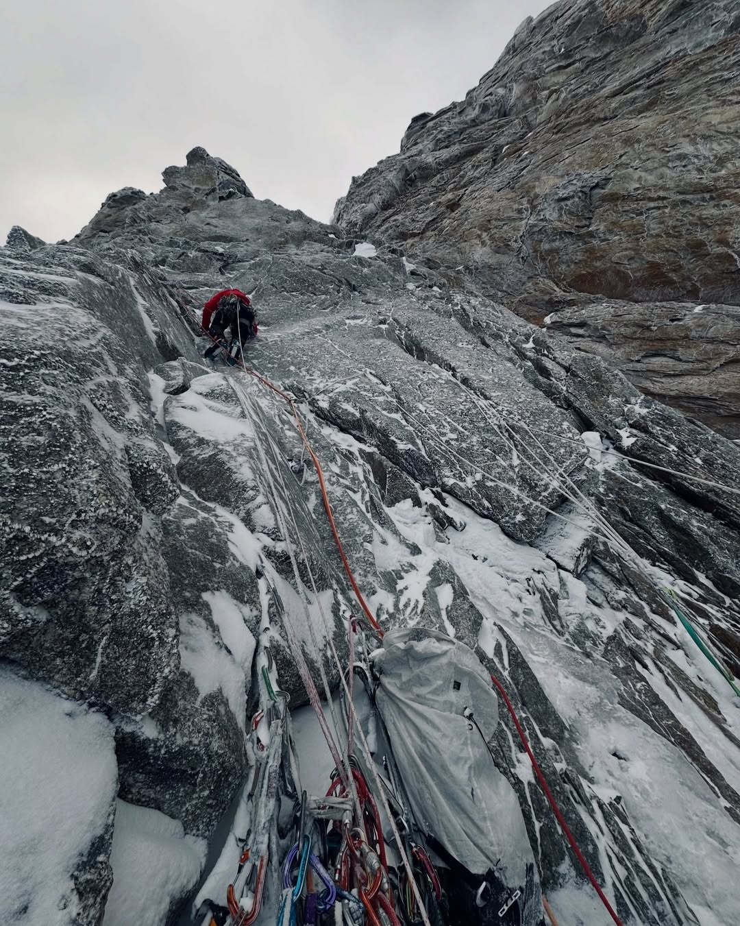 Quella notte, però, tutto cambia davvero. La finestra meteo che sembrava stabile si chiude all’improvviso e la parete si trasforma. Una perturbazione scarica neve continua sul portaledge, mentre il freddo e l’umidità iniziano a entrare ovunque. “Mi sono svegliato nel panico, completamente coperto di neve, senza riuscire a respirare bene tra i pochi spazi lasciati dalla giacca e dal sacco a pelo” racconta Poindefert. “Non c’era altro da fare che resistere”. Nel corso della notte cadono fino a 60 centimetri di neve. Il portaledge diventa un vero e propri contenitore, il materiale si bagna, parte dell’attrezzatura si danneggia: i materassini iniziano a non isolare più, i sacchi a pelo si inzuppano, dormire diventa quasi impossibile. A quella quota e in quelle condizioni, anche le operazioni più semplici, come muoversi, sistemare il materiale, restare asciutti, diventano complicate. “Ci siamo chiesti se saremmo riusciti a resistere per più giorni con i sacchi a pelo bagnati. Ma nessun ‘cartellino rosso’ ci obbligava a scendere. E allora abbiamo deciso di continuare”.