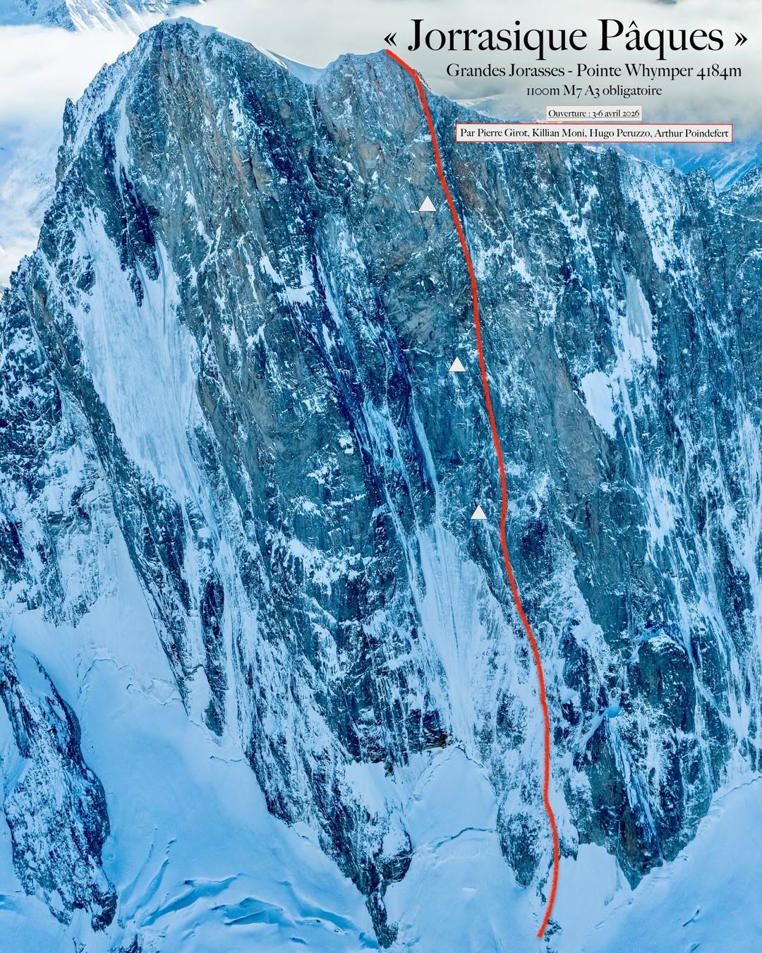 Quattro giovani alpinisti francesi hanno aperto una linea di 1100 metri (ED+ M7 A3) sulla parete nord delle Grandes Jorasses. La via raggiunge la Punta Whymper.