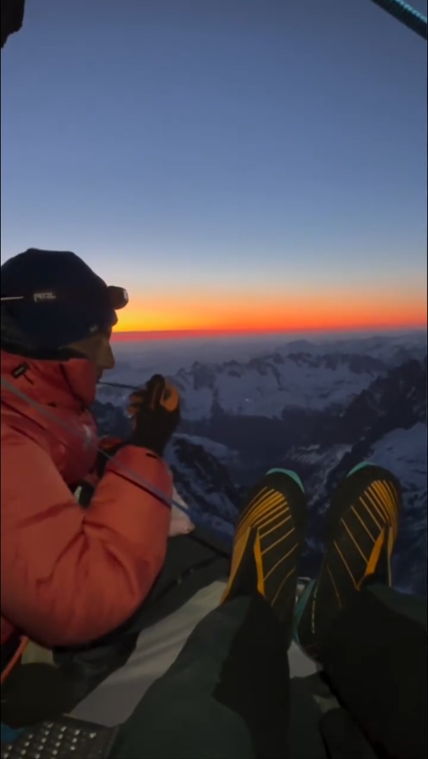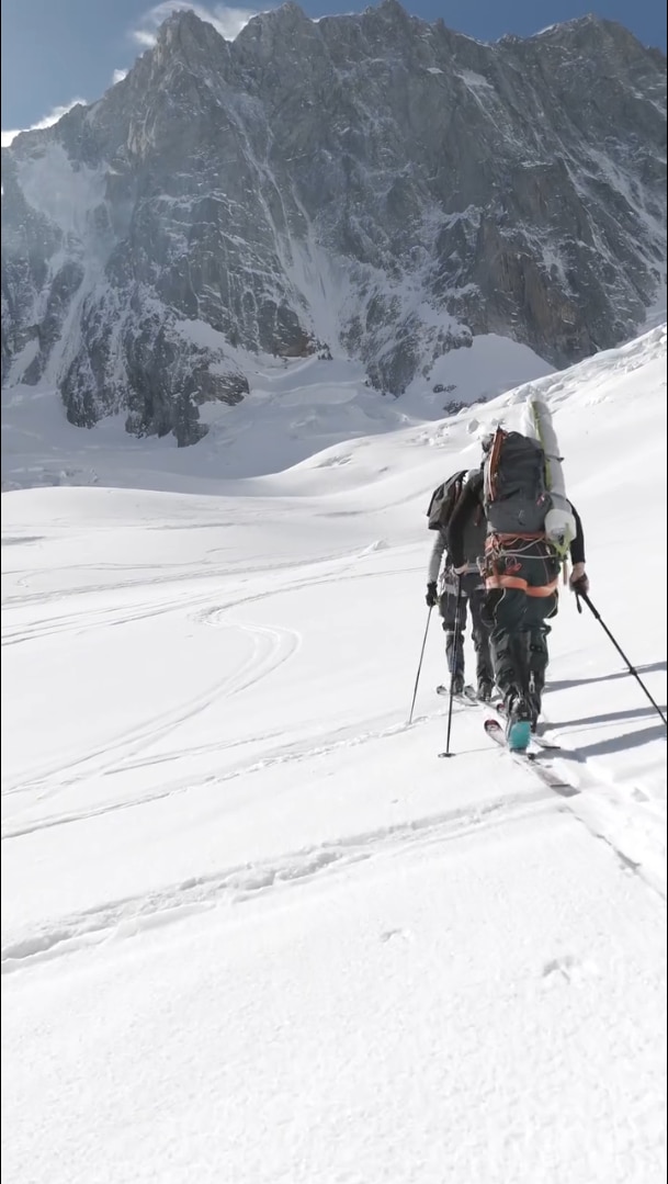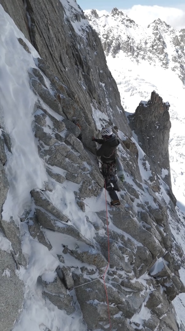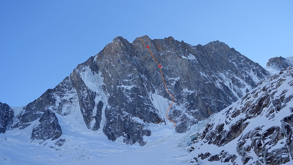 Una salita lunga e complessa, costruita nel tempo. “Dopo tanta cattiva meteo, alti e bassi, tanto impegno e soprattutto tanta energia per cercare di farne anche un film, siamo felicissimi di averlo portato a termine”. La progressione si è svolta in stile alpino su una delle muraglie più severe del massiccio del Monte Bianco. Ma è la discesa a rendere ancora più singolare la realizzazione: “Avevamo scommesso di portarci le vele, con il sogno di decollare dalla cima. Dopo 1100 metri passati a trascinare il nostro saccone, è stato con molta apprensione che abbiamo tirato fuori i parapendii, con vento sfavorevole e ancora tutto il materiale addosso. Pieni di adrenalina ed emozione, siamo atterrati sul versante italiano verso le 9 del mattino.