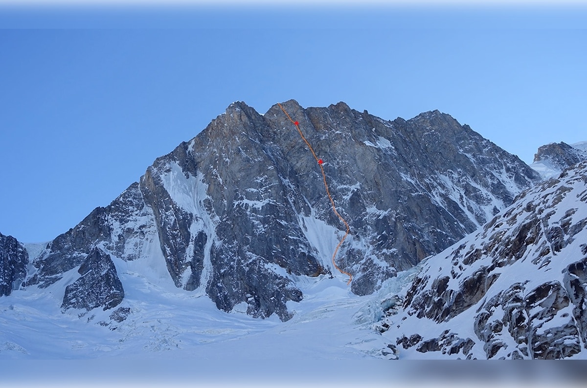 Una salita lunga e complessa, costruita nel tempo. “Dopo tanta cattiva meteo, alti e bassi, tanto impegno e soprattutto tanta energia per cercare di farne anche un film, siamo felicissimi di averlo portato a termine”. La progressione si è svolta in stile alpino su una delle muraglie più severe del massiccio del Monte Bianco. Ma è la discesa a rendere ancora più singolare la realizzazione: “Avevamo scommesso di portarci le vele, con il sogno di decollare dalla cima. Dopo 1100 metri passati a trascinare il nostro saccone, è stato con molta apprensione che abbiamo tirato fuori i parapendii, con vento sfavorevole e ancora tutto il materiale addosso. Pieni di adrenalina ed emozione, siamo atterrati sul versante italiano verso le 9 del mattino“.