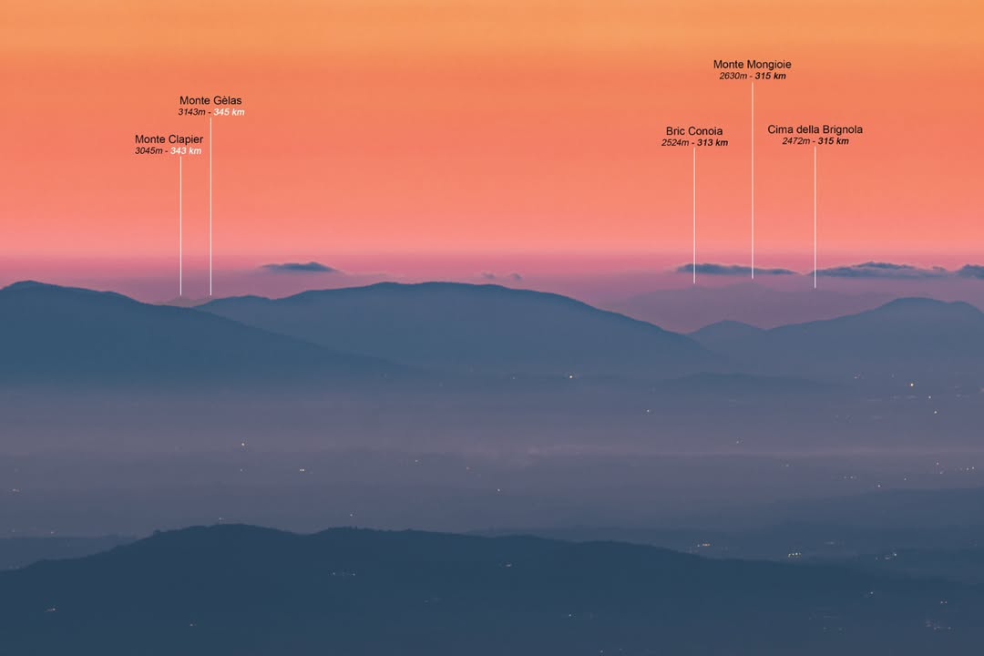 Nella fotografia si distinguono con sorprendente nitidezza alcune vette normalmente invisibili da questa posizione: il Monte Gèlas (circa 345 km), il Monte Clapier (343 km) e il massiccio del Mongioie (315 km). Una visione che, in condizioni standard, risulta impossibile sia per la curvatura terrestre sia per l’umidità presente nell’aria che offusca la visibilità. Ma anche per la presenza di catene montuose che solitamente ostacolano la vista di queste cime.