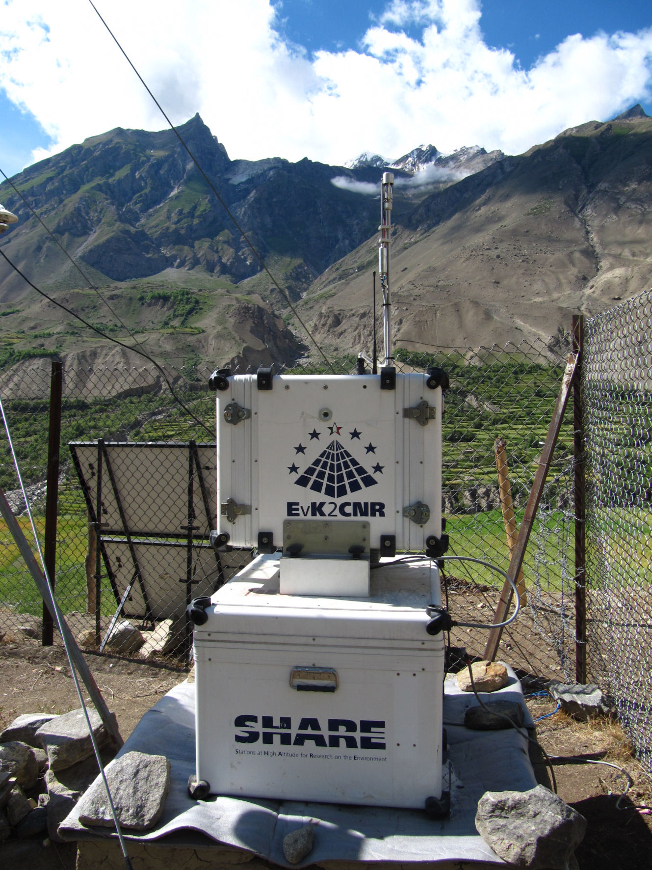 Il Nano-Share è una sistema di monitoraggio climatico – ambientale promosso da EvK2CNR e messo a punto e realizzato insieme al CNR-ISAC di Bologna ed al CNRS-LGGE di Grenoble, realizzato nell’ambito del progetto internazionale Share – Stations at High Altitude for Research on the Environment. Negli anni scorsi ha effettuato rilevazioni nella valle del Khumbu, in Nepal, e sul ghiacciaio dello Stelvio. Ad agosto è stato installato in Karakorum dai due tecnici del Comitato EvK2Cnr Gianpietro Verza e Marcello Alborghetti. Si trova ad Askole, ultimo villaggio raggiungibile in auto sulla via che porta al K2: 800 abitanti e 3000 metri di quota. Da qui lo strumento rileverà ozono e aerosol nel Parco del Karakorum durante la campagna di misura che durerà fino a fine ottobre.