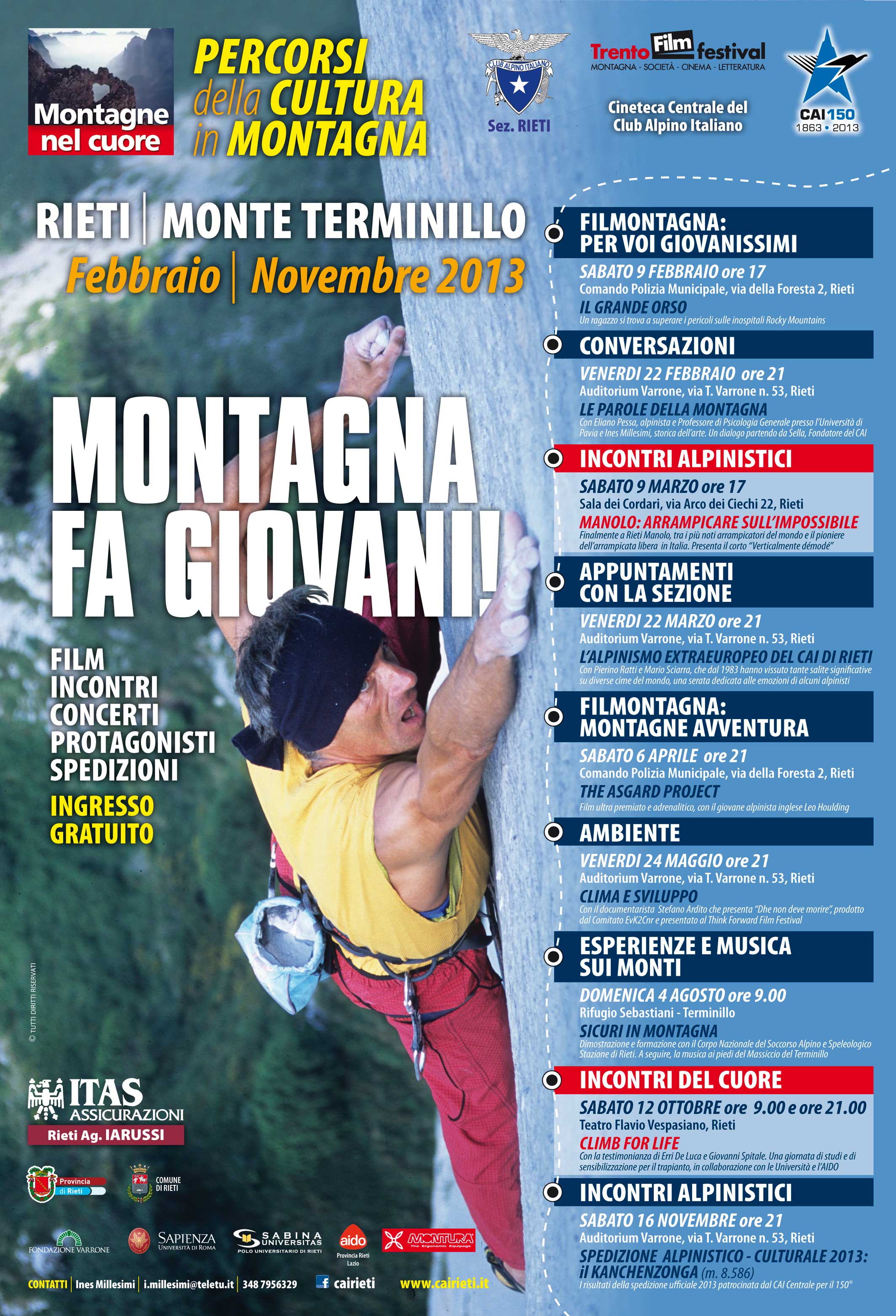 Quest’anno Montagne nel cuore è dedicato ai giovani, non vuole celebrare solo il passato ma intende guardare al futuro con lo slogan “Montagna fa giovani!”. Dopo il film d’avventura per ragazzi ambientato in montagna, il 22 febbraio (ore 21, Auditorium Varrone) ci sarà una conversazione particolare e molto curiosa su montagne, racconti e pittura con Eliano Pessa, alpinista, ricercatore di Fisica e ordinario della cattedra di Psicologia Generale presso l’Università di Pavia e Ines Millesimi, storica dell’arte. Si parlerà di Quintino Sella, fondatore del CAI nel lontano 1863, ma anche delle “professioni” dei frequentatori di oggi delle montagne: non solo guide, ma anche fisici, musicisti e medici. Nel corso della serata si aprirà anche uno spazio dedicato agli studenti del Liceo Artistico di Rieti che hanno partecipato al concorso di racconti di montagna PREMIO ITAS, il cui esito sarà presentato a Trentofilmfestival 2013.