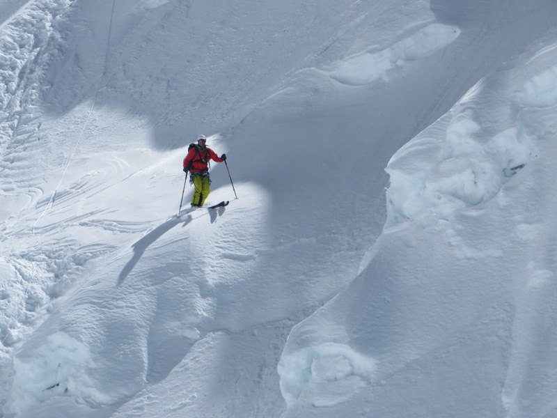 “Rispetto allo sloveno che superò l’Ice Fall tutto sulla sinistra – racconta Colli -, io ho preferito sciare una nuova linea in centro all’Ice Fall, più diretta ma anche maggiormente crepacciata. La parte sinistra ritengo sia troppo un pendio sotto valanga in questi giorni”.