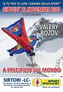 SIRTORI, Lecco — Si preannuncia una serata davvero emozionante quella in programma giovedì 21 novembre presso il punto vendita df-Sport Specialist di Bevera di Sirtori, che ospiterà l’alpinista e base jumper russo Valery Rozov. La sua ultima impresa è stata gettarsi con la tuta alare dalla parete Nord dell’Everest, da quota 7.220 metri.