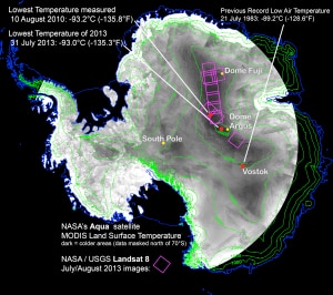Una ricerca statunitense ha analizzato le rilevazioni delle temperature di 32 anni da parte dei satelliti. Il satellite Landsat 8, parte di un progetto della Nasa e del Servizio geologico degli Stati Uniti (Usgs), ha registrato il 10 agosto 2010 la temperatura più bassa mai rilevata sulla Terra: -93,2 gradi centigradi pari a a -135,8 gradi della scala Fahrenheit.