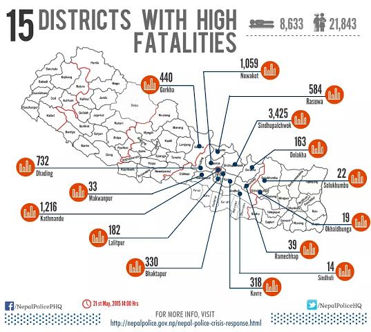 La cifra delle vittime supera abbondantemente gli 8000: secondo la polizia nepalese i morti sarebbero 8.633, mentre secondo la Croce Rossa Internazionale 8.485, a cui si sommano però altri 755 dispersi. Del totale 152 hanno perso la vita nella seconda scossa. Poi ci sono i feriti: per la Croce Rossa 18.194, mentre per la polizia 21.843.