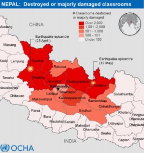 Secondo la Croce Rossa le famiglie colpite dal sisma sarebbero 1.120.103, quelle dislocate 642.877. Il numero delle scuole distrutte ammonterebbe a 3.913, mentre per l’Ocha (Office for the Coordination of Humanitarian Affairs), l’Ufficio delle Nazioni Unite per gli Affari Umanitari, sono 25.000 le classi distrutte e 10.000 quelle che richiedono interventi. È stato stimato che circa 870.000 bambini di età compresa tra i 3 e i 18 anni non potranno tornare a scuola quando saranno riaperte, secondo i programmi il 31 maggio.