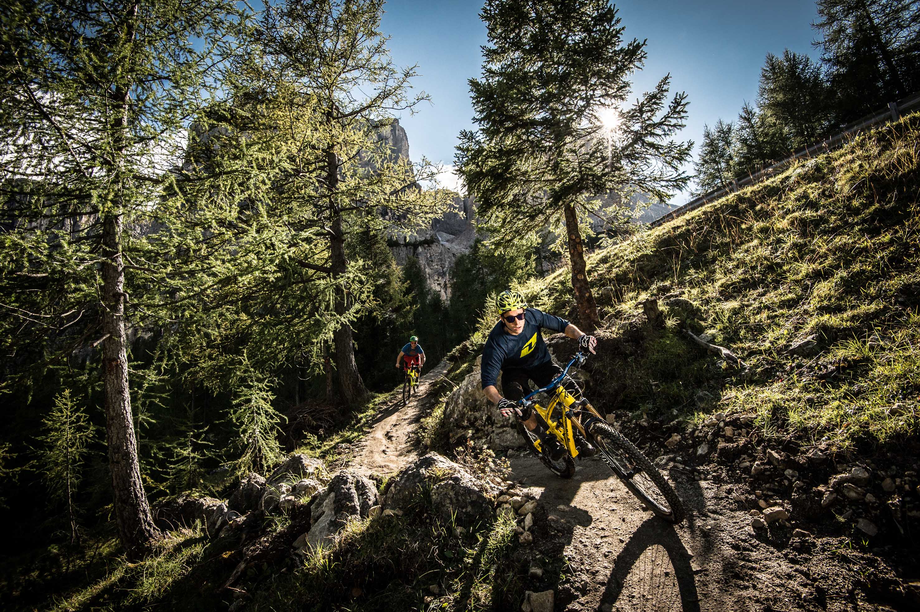 Spettacolare single trail tour intorno al maestoso massiccio del Sella su 8 single trails per 34 km di discese e 4.570 metri di dislivello in discesa (450 metri da pedalare in salita).
