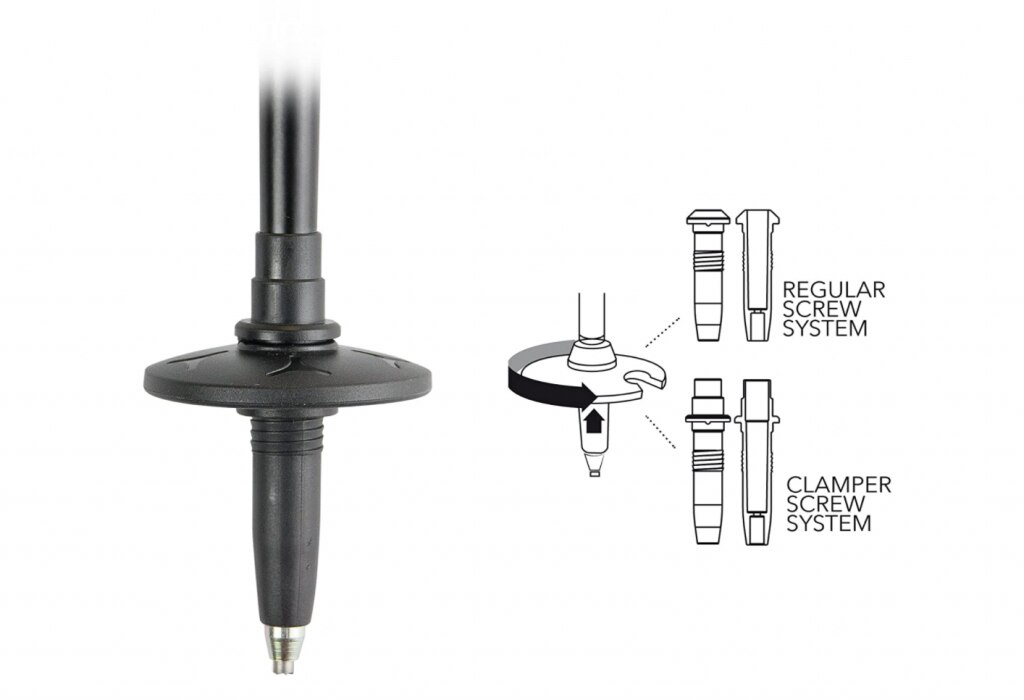 Il puntale un blocco unico, possiede una piccola rotella fissa ideale per le escursioni estive, sulla quale si può montare quella invernale mediante un innovativo sistema. (vedi foto).