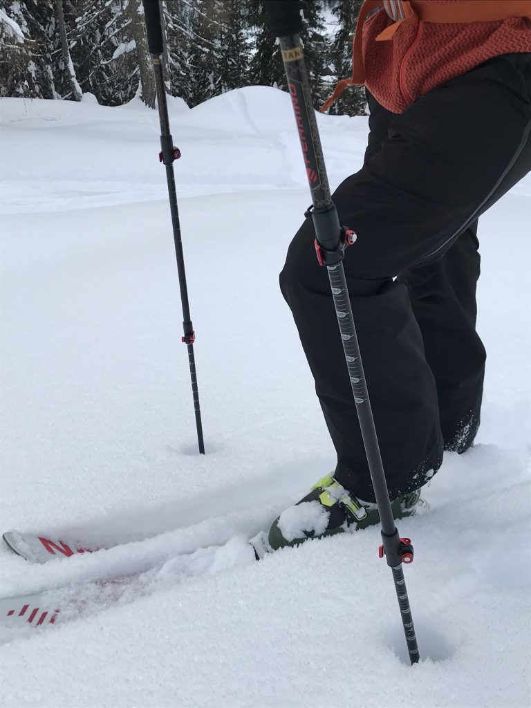 Il lacciolo che avvolge il polso è di facile e precisa regolazione (vedi foto). Per aprire i due segmenti, sono presenti due levette di metallo con regolazione di precisione (vedi foto), molto funzionali anche usando i guanti. Durante la prova, avvenuta in una settimana tra escursioni con le racchette da neve e gli sci da scialpinismo, i bastoncini Mustang, si sono rivelati funzionali, soprattutto grazie al peso ridotto e al buon bilanciamento in discesa con gli sci.