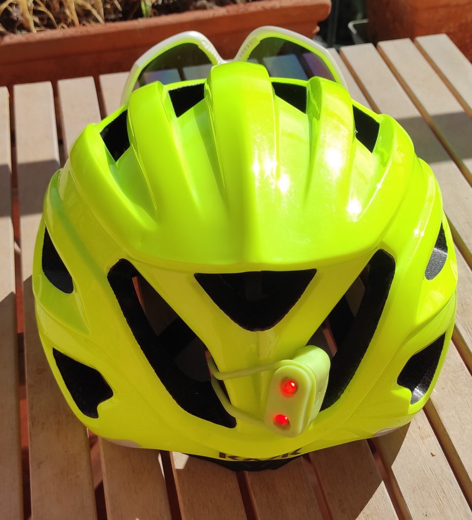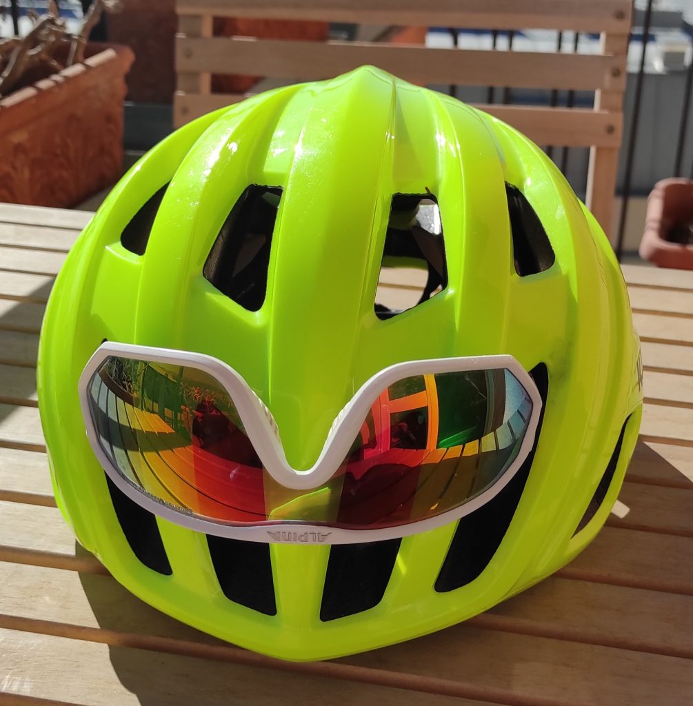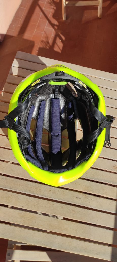 Dopo 31 giorni a pedalare in giro per le alpi l’ho tenuto in testa per talmente tanto tempo che alla fine i capelli, seppur corti, avevano preso la forma dell’imbottitura interna e ho dovuto tagliarli per farli tornare normali. In effetti il casco risulta molto comodo e leggero e mi sono ritrovato spesso durante le varie soste, anche lunghe, con il casco sempre in testa allacciato senza accorgermene. In alcuni giorni molto caldi, con temperature fino a 36 gradi, ho apprezzato la ventilazione che mantiene in testa una temperatura sopportabile. In alcune discese invece, sudato e con temperature più fresche, ho aggiunto una fascia o un buff. La regolazione posteriore con microrotella e l’imbottitura costituita da cuscinetti in gel, infatti, permettono di adattare bene il casco in testa. I lati la parte frontale e posteriore sono piuttosto ampi per proteggere meglio in caso di caduta. Gli occhiali si possono eventualmente incastrare nella parte anteriore del casco sfruttando le vie d’aria e rimanendo ben fissi. Io ho inserito un led rosso di segnalazione nella parta posteriore del casco che accendevo agevolmente in galleria o in caso di scarsa visibilità per essere meglio individuabile dai mezzi che sopraggiungevano. Per lo stesso motivo ho scelto un colore giallo fluo che permette di essere ben visibili in strada. Il casco è comunque disponibile in ben 16 diverse colorazioni.