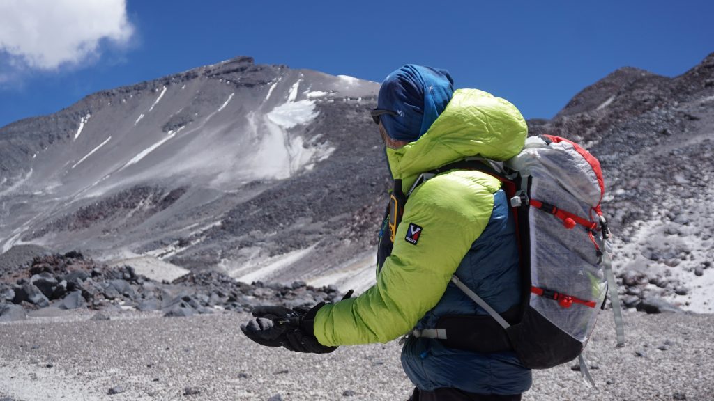 Ho utilizzato il piumino durante le ore più fredde della mattina presto e della sera, durante la prima parte della salita alla cima con partenza di notte (temperatura -12°), durante la permanenza sulla cima e per tutta la discesa fino al campo base. Durante una notte particolarmente fredda in tenda, al campo Atacama (5240m), durante la quale non riuscivo a dormire proprio a causa del freddo, l’ho indossato dentro il sacco letto risolvendo il problema. Appena indossato la sensazione di calore e protezione è immediata, e offre una buona risposta anche in condizione meteo di vento teso. Ottima risposta alle abrasioni anche durante le fasi di arrampicata su roccia durante la parte finale della salita. Esternamente dispone di due larghe tasche laterali in basso due più ridotte in alto sul petto, internamente ha una tasca con cerniera e una retina aperta porta guanti o berretto. Il cappuccio è regolabile sul collo e nella parte posteriore e può contenere comodamente un eventuale casco. La zip principale si può aprire anche dal basso. Ha la regolazione tramite cordino elastico in vita. La sacca di compressione per riporlo nello zaino ha misure fin troppo generose, potrebbe essere ridotta di almeno 1/3.