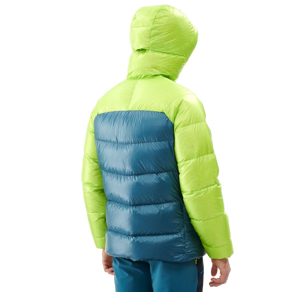 Tessuto esterno in PERTEX DIAMOND 100% POLYAMIDE resistente agli strappi e trattamento impermeabile K-DRY DOWN, imbottitura 100% piuma d’ oca, 800 cuin. Il colore giallo lime su cappuccio, spalle e parte della schiena è ben identificabile in montagna anche per ragioni di sicurezza.