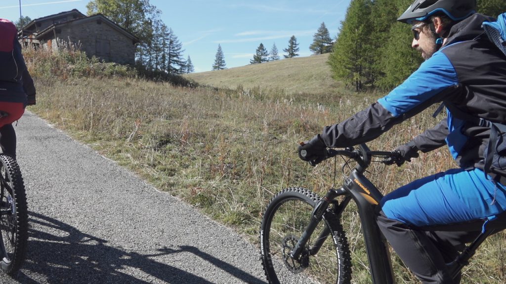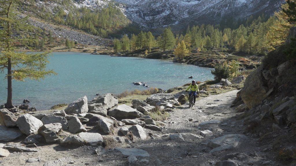 Giro in EMTB a La Thuile, in Valle d’Aosta, su strada poderale dal Colle San Carlo al Lago d’Arpy e ritorno.