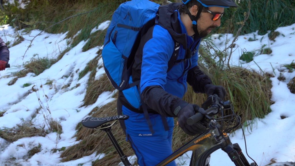 Il sentiero parte con due tratti flow e veloci con un misto di terra battuta e un breve tratto su pietraia, su alcuni punti abbiamo trovato un po’ di neve ma percorribile, con le dovute precauzioni. Il punto più tecnico è caratterizzato da alcuni tornanti e gradini naturali formati da rocce e radici. Dopo si entra in una serie di paraboliche molto divertenti e veloci. Nel bosco il sentiero si fa più largo, in terra battuta e con una grande scelta di linee.