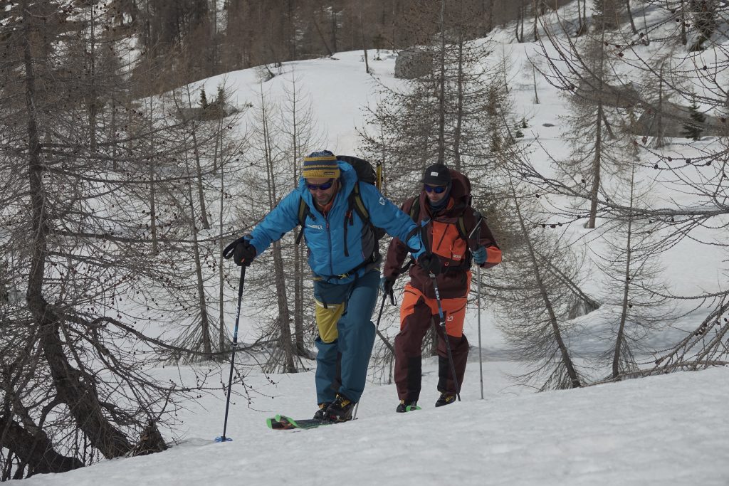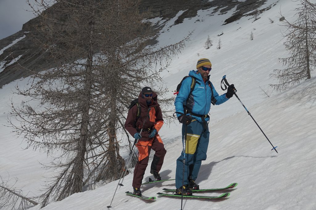 Neve dura il primo giorno e sempre più primaverile fino a completamente trasformata quasi ovunque nei giorni seguenti. Manto nevoso perfettamente stabile anche sui pendii molto ripidi.