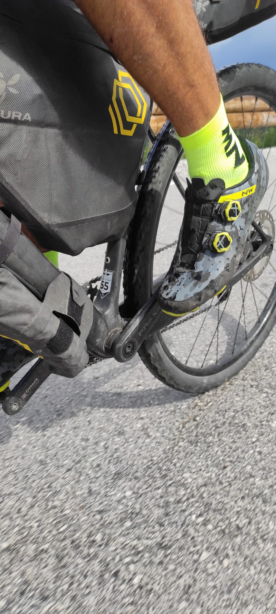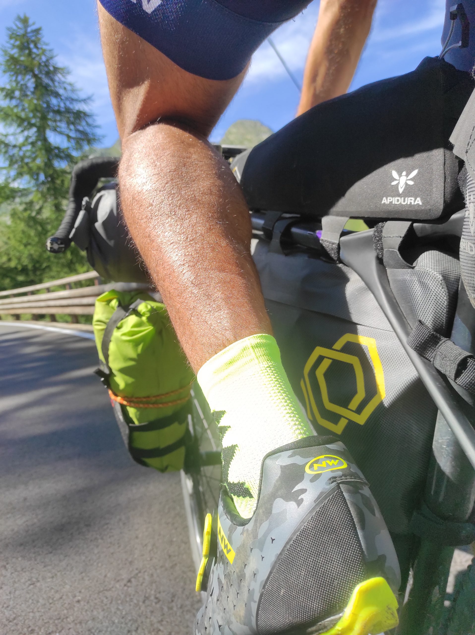 La Northwave Rebel 2 è stata la scarpa giusta. Mi sono bastati un paio di giorni per prendere le misure con la doppia regolazione del rotore. In un primo tempo stringevo troppo entrambi con successivi problemi di circolazione, quando ho imparato a registrarli ad uno ad uno la scarpa è risultata comoda e performante. Non esistendo la taglia intermedia 43.5, che corrisponde alla mia misura, ho optato per una taglia 44 a cui ho aggiunto un sotto suola interno. Per tutta la durata del tour ho utilizzato calzini leggeri Northwave Extreme Air Mid in filato Meryl Skinlife. In una giornata di pioggia e freddo con temperature fino ai 5 gradi ho utilizzato i sovrascarpe impermeabili, altrimenti non ho mai avuto problemi di freddo. Nel senso opposto in una giornata particolarmente calda sul passo Giovo con temperature fino a 37° non ho avuto problemi di surriscaldamento del piede e sudorazione eccessiva.
