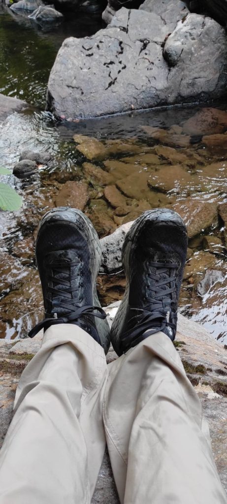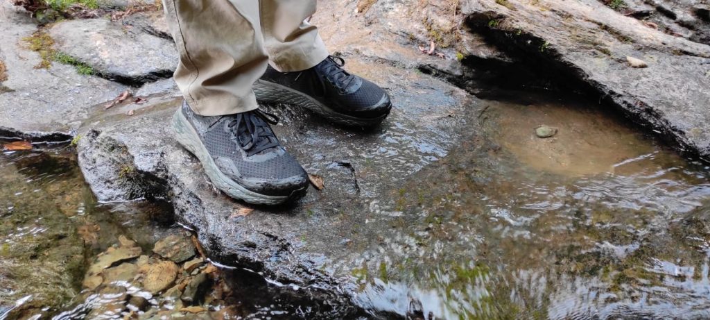La scarpa risulta comoda e leggera durante la camminata mantenendo una buona stabilità e rimanendo coesa con il piede durante l’intera rullata. Lo spessore della suola con tecnologia Omni-max ammortizza molto ad ogni passo soprattutto in discesa. Abbiamo voluto forzare la velocità di alcune nostre escursioni sia in salita e soprattutto in discesa sia su terreni petrosi che su terreno compatto e la risposta della scarpa è sempre stata molto reattiva combinando al peso ridotto un’ ammortizzazione molto accentuata. Discreta la risposta della suola su terreni bagnati. L’altezza della suola penalizza un minimo la camminata trasversale su terreni erbosi anche se considerando la struttura pensavo si sentisse molto di più. Particolarmente apprezzata durante la nostra prova in considerazione dell’estate particolarmente piovosa è stata la struttura Outdry che rende la scarpa impermeabile e traspirante il che ci ha permesso di evitare di bagnarci i piedi nelle uscite dei giorni di pioggia. La membrana Outdry, esterna alla struttura della scarpa a differenza di altre permette all’intera scarpa di non inzupparsi rimanendo più leggera e asciugando più in fretta.