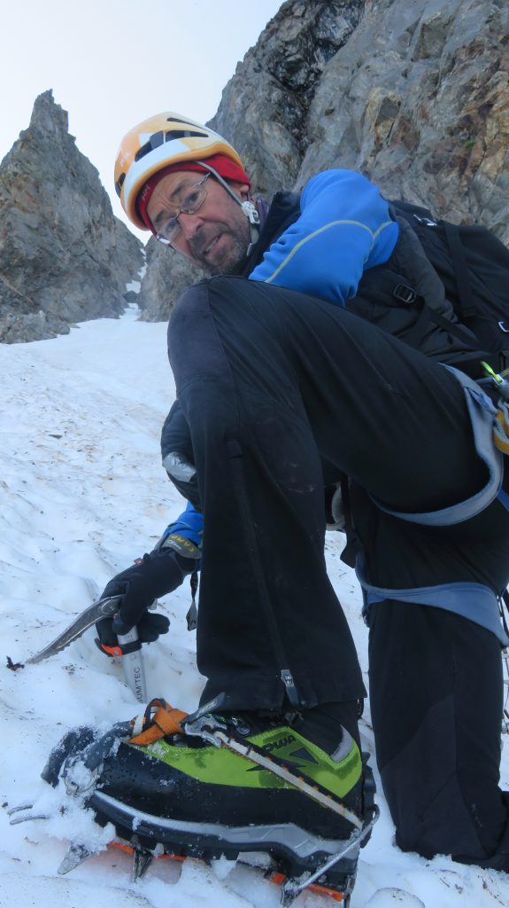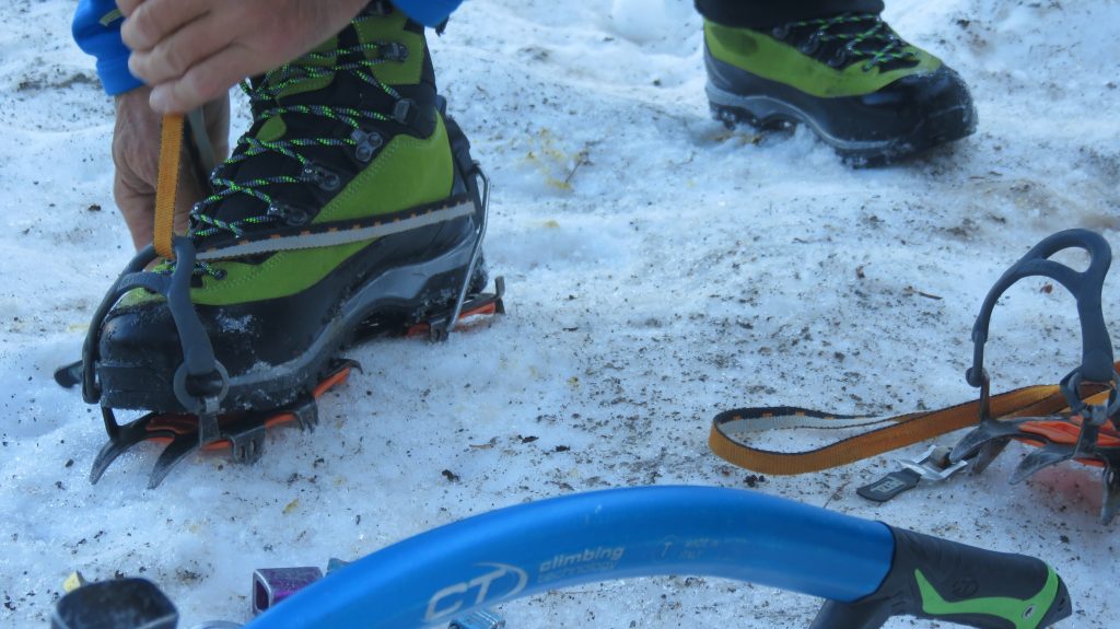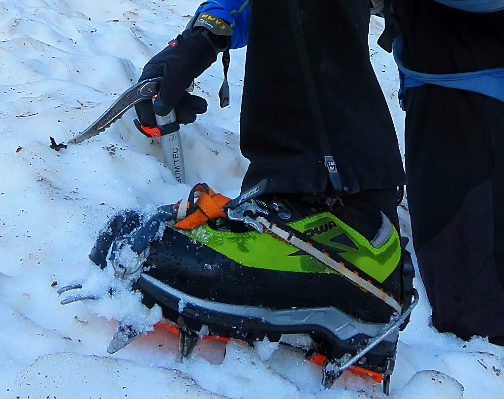 Canale: perfetta adattabilità ai ramponi con gabbietta anteriore. Durante la salita del canale buono lo snodo di caviglia e la sensazione di compattezza tra scarpone e rampone.