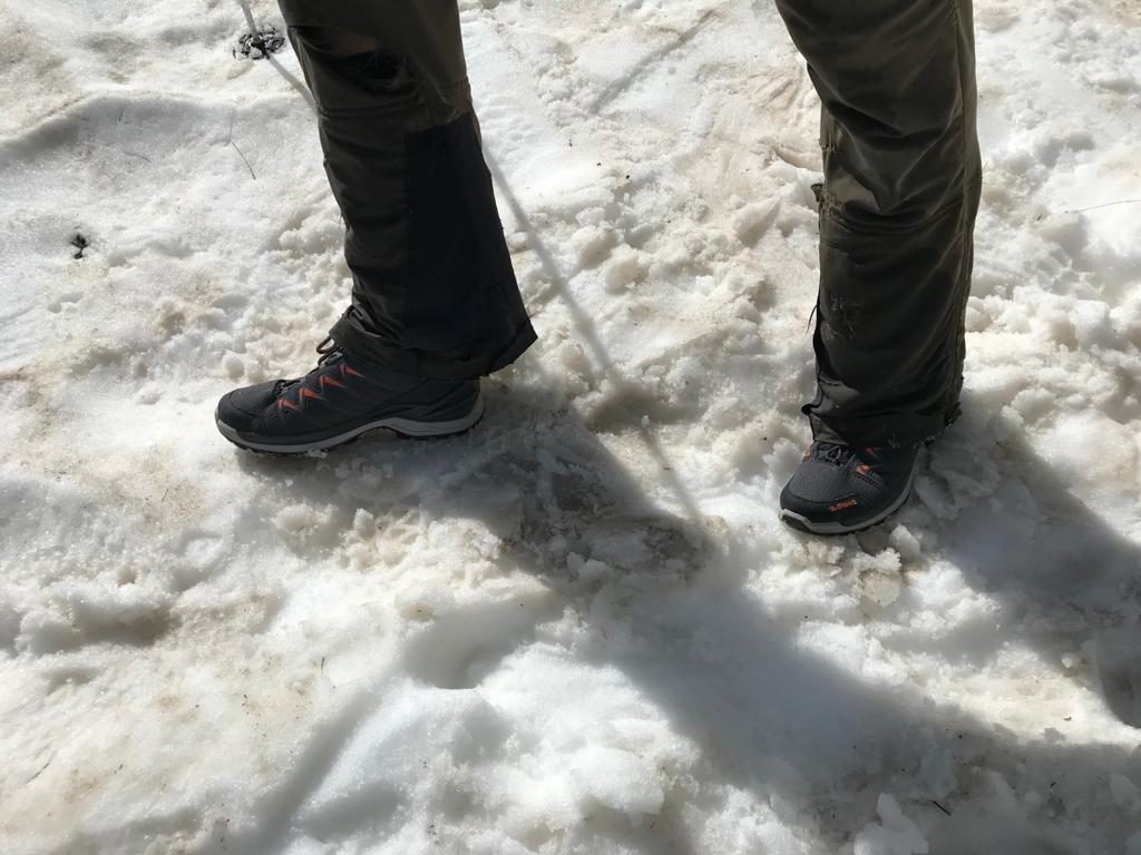 In queste situazioni la suola della scarpa ha risposto bene alla presa sulla roccia e ha dimostrato una buona tenuta laterale sia sull’erba ripida che sulla neve quando il sistema di allacciatura è in tensione.