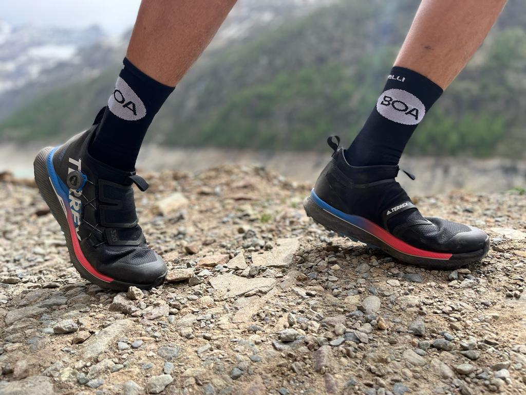 Ad un primo esame la scarpa si presenta leggera ed essenziale, il comfort è garantito dal sistema a wrap che questo serra il piede in modo controllato e omogeneo sia nella parte anteriore impedendo gli scorrimenti laterali sia nel tallone, evitando sollevamenti del calcagno in fase di spinta (evitando così i possibili sfregamenti). Questa chiusura che da tempo vediamo su scarponi da montagna e scialpinismo è entrata a far parte anche delle scarpe da running, con i suoi vantaggi, come la chiusura rapida e micrometrica, inoltre in caso di forte impatto, la cartuccia è progettata per sganciarsi dalla baionetta. In salita spinge discretamente nella parte anteriore. La rullata è garantita dalla suola tipica delle scarpe da Trail dove le quote tra terra e suola sono differenziate tra la punta e il tallone. In discesa il tallone delle Terrex Agravic Pro è ben sostenuto e la pressione è distribuita su tutto il mesopiede lasciando le dita libere di muoversi. La costruzione BOA PerformFit Wrap è un sistema che permette di migliorare le performance grazie alla perfetta connessione tra il piede e la suola. Il tutto senza ridurne il comfort, decisamente importante per una scarpa dedicata alle lunghe distanze.