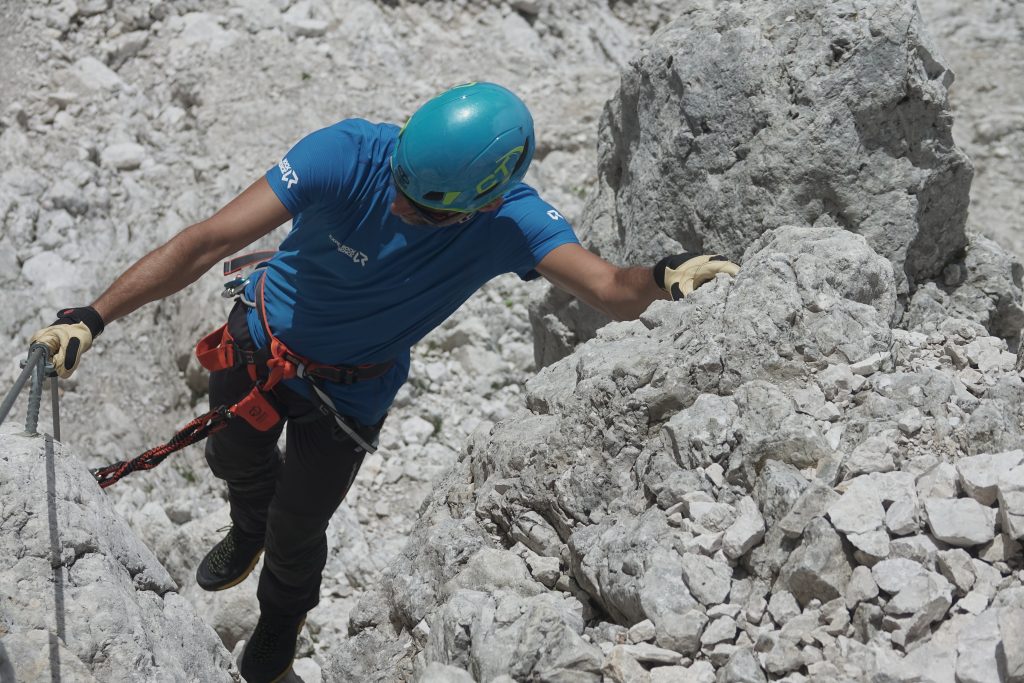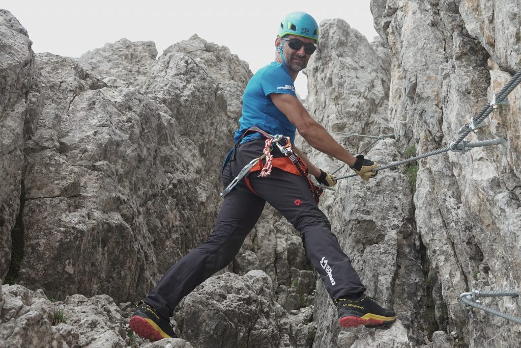 Durante l’avvicinamento in salita e in discesa la rullata è regolare, la scarpa risulta comoda e precisa sia sui tratti di sentiero pietrosi sia su tratti rocciosi. Durante la progressione in ferrata, in salita o in discesa, sono riuscito a utilizzare la punta e la suola quasi come se avessi delle scarpette da arrampicata nei piedi lavorando in aderenza e di precisione sugli appigli e i gradini più grandi e più piccoli.