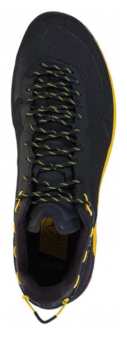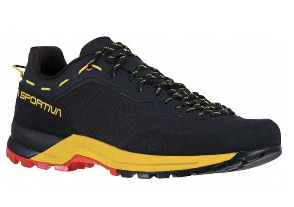 Nuova forma TechFit, allacciatura asimmetrica fino in punta, pacchetto suola/intersuola in doppia EVA, bordo protettivo climbing-inspired in materiale leggero PU-TECH Lite, suola Vibram a doppia mescola Megagrip nella parte anteriore e Idrogrip nella parte posteriore.