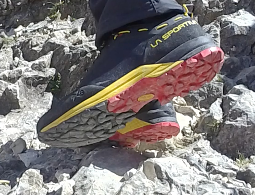 La suola Vibram dimostra un grip inaspettato sia lavorando in punta che in aderenza di piatto in salita e in discesa. Sugli scalini e sulle scale è aderente e precisa. Anche sui pochi tratti bagnati e in fase di attraversamento di alcuni brevi nevai, soprattutto durante l’avvicinamento, ha riposto in modo molto adeguato e aderente.