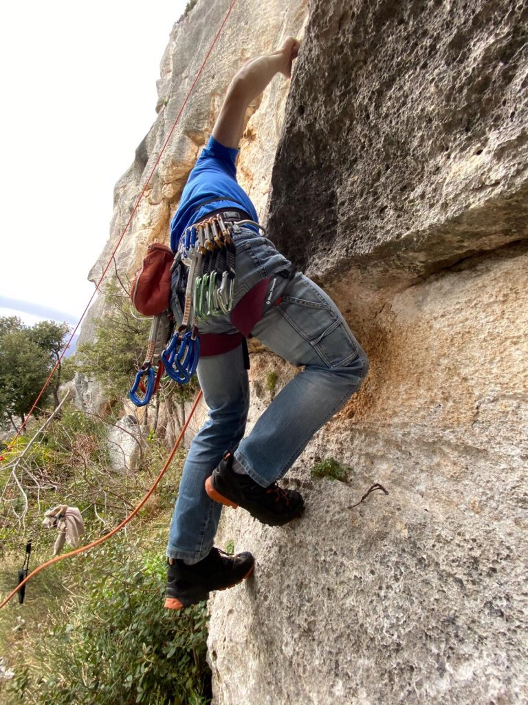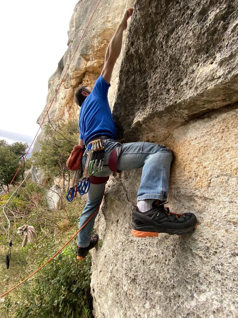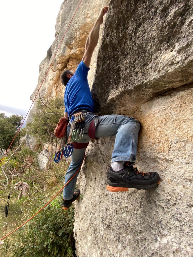 La scalata: ho cercato di forzare più possibile il limite di questa scarpa, portandola sui bei muri dell’Olimpo, storico settore della Rocca di Perti. Il doppio sistema di allacciatura la rende adatta ad avvicinamenti o scalate facili, questo grazie anche alla mescola megagrip, che provata sulla placca sorprende per la precisione e l’ottimo grip.