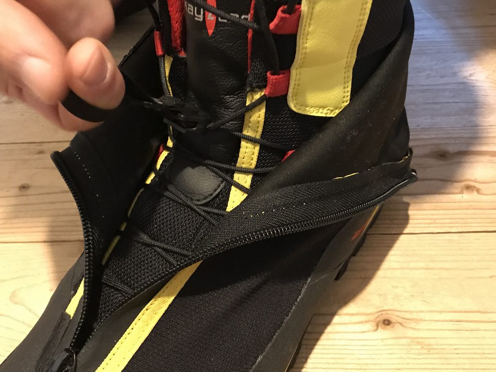 La parte esterna dello scarpone è costituita da una ghetta protettiva che termina nella parte superiore con una piccola fascia elasticizzata che si apre mediante una cerniera Easy Zip waterproof, che parte leggermente esterna nella parte alta e termina quasi sulla punta dello scarpone.