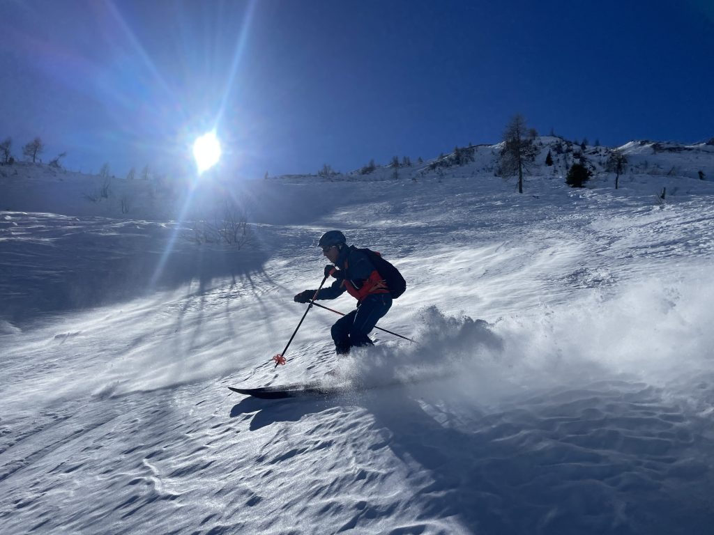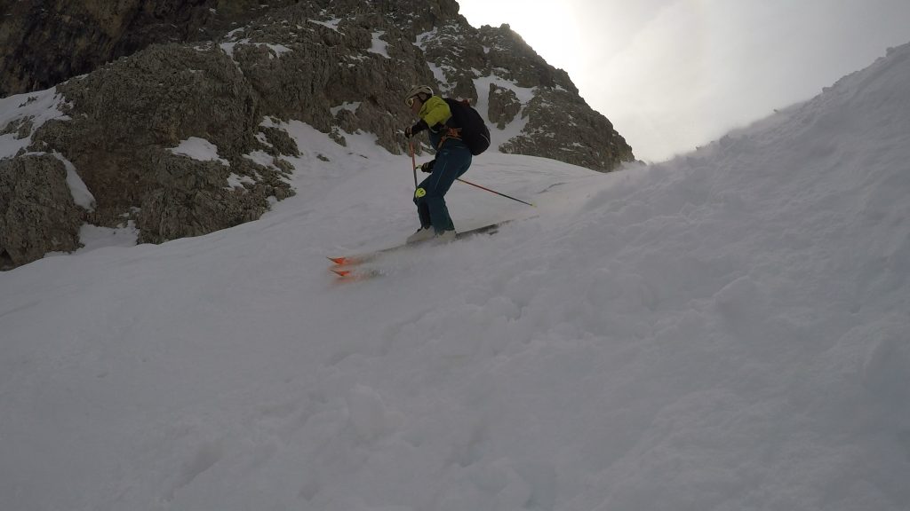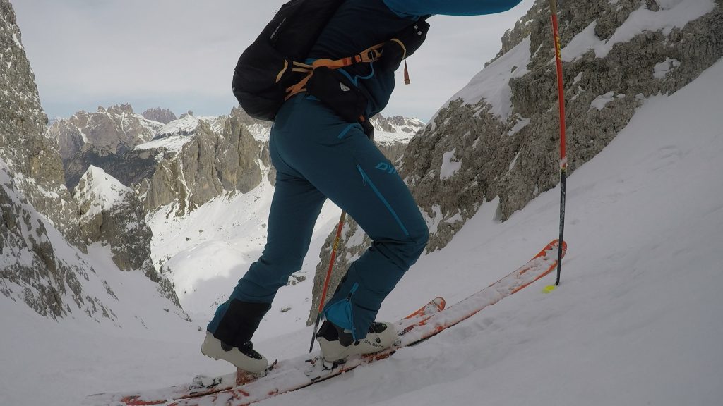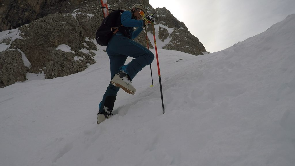 Grazie al peso ridotto e all’ampio range di articolazione del gambetto (75 gradi dichiarati), lo scarpone è molto efficiente in salita, sia sul passo che nelle inversioni. Anche la tenuta del tallone è buona, grazie alla scarpetta anatomica anche senza aver effettuato la termoformatura.
