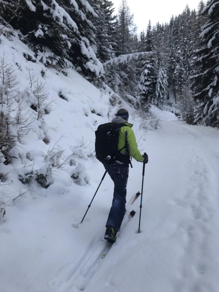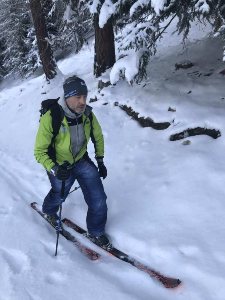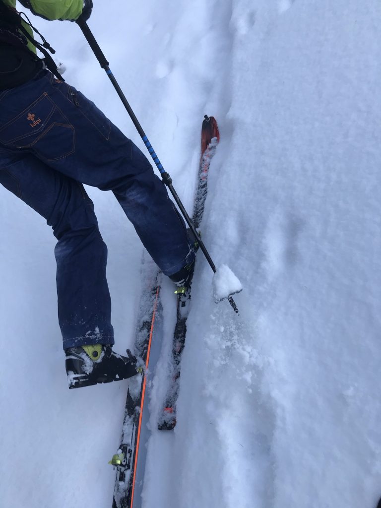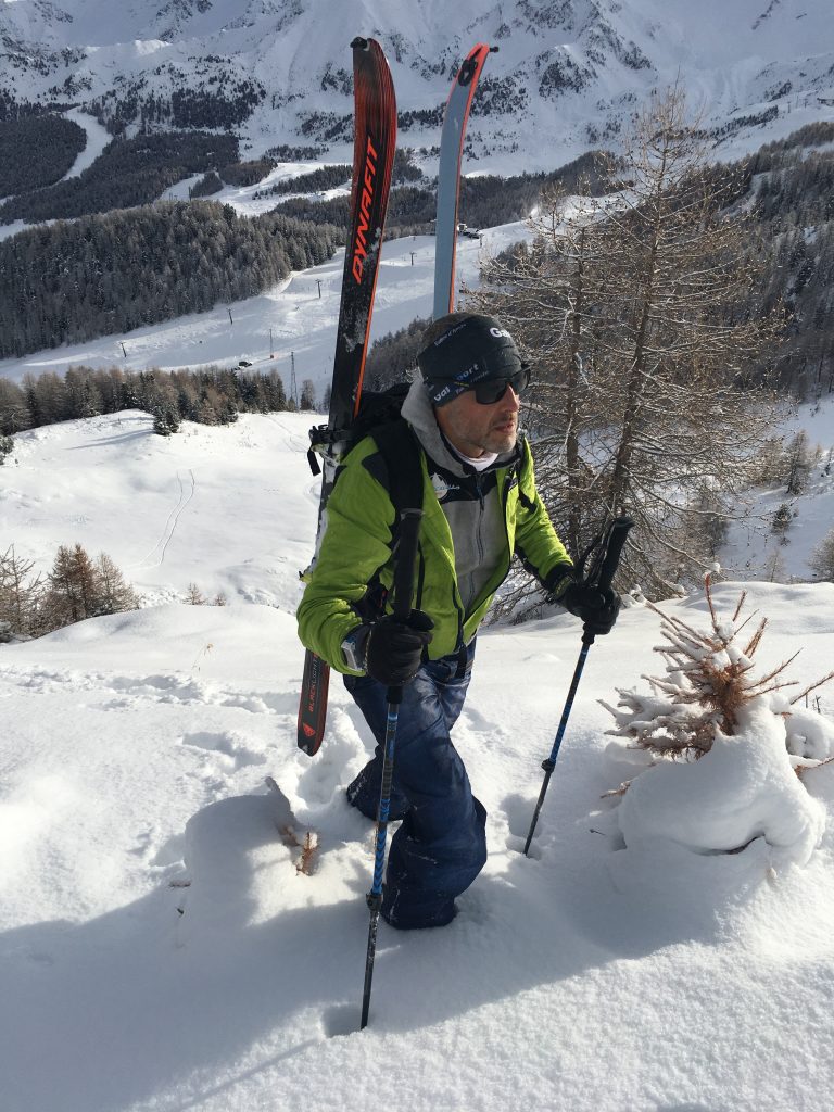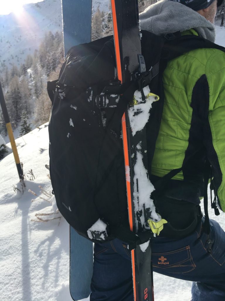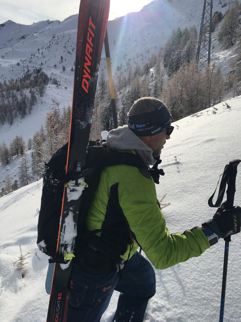 Salita: in pista, dove l’elemento che incide maggiormente è il peso, è quasi in linea con altri sci da gara, così come su traccia battuta; invece nei tratti da battere e nella crosta il galleggiamento è buono soprattutto della parte anteriore. La rimozione della pelle durante il cambio d’assetto per la discesa è stata effettuata con sgancio dello sci dallo scarpone e non in modalità gara, visto che la pelle in dotazione aveva anche il gancio posteriore.