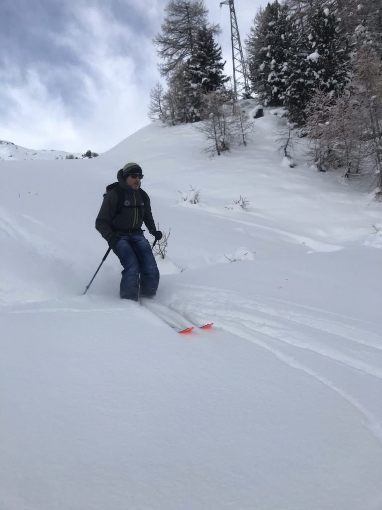 Discesa: in pista sul battuto lo sci tiene bene le traiettorie anche quando le velocità aumentano ed è agile nei cambi. Nel terreno sconnesso si avverte qualche vibrazione soprattutto in punta. A volte mi capita di sbilanciarmi indietro soprattutto quando da neve soffice e polverosa si passa improvvisamente a neve dura e qui lo sci perdona parecchio assecondando il movimento e scongiurando la caduta. In fresca lo sci galleggia grazie alle dimensioni sotto il piede e consente di mantenere una posizione più centrale che permette di rilassare il quadricipite.