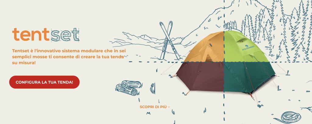 Tent Set offre la possibilità di scegliere i seguenti parametri: il numero dei posti delle persone, l’interno, la paleria, il telo esterno, i picchetti e gli accessori, le personalizzazioni di colore, grafica, logo, disegni e scritte.