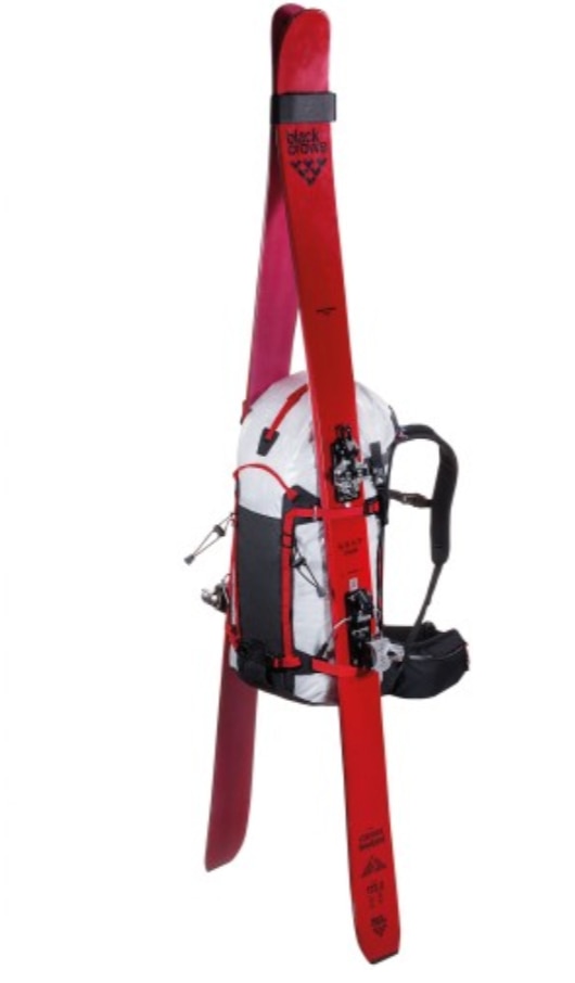 - porta materiali/scomparti Tasche: Su fascia a vita | Posteriore | Due porta piccozza | Porta sci laterale | Porta sonda / pala interno, Asole porta materiali su fascia a vita e interno dorso