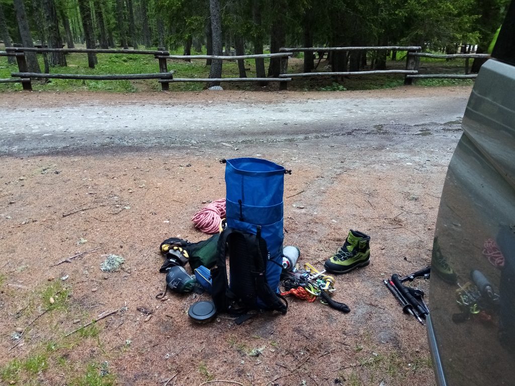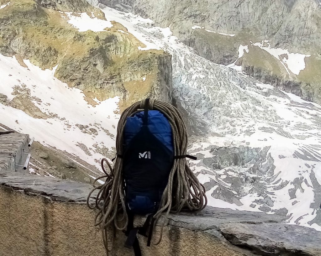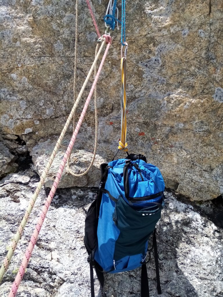 Trasporto della corda e accesso allo zaino: fermare la matassa a cavallo dello zaino con le cinghie di compressione alte e la fettuccia di chiusura della tasca elastica. In questo modo quando si deve accedere allo zaino basta sganciare la fettuccia della tasca e scostare leggermente la corda così da non doverla risistemare da capo.