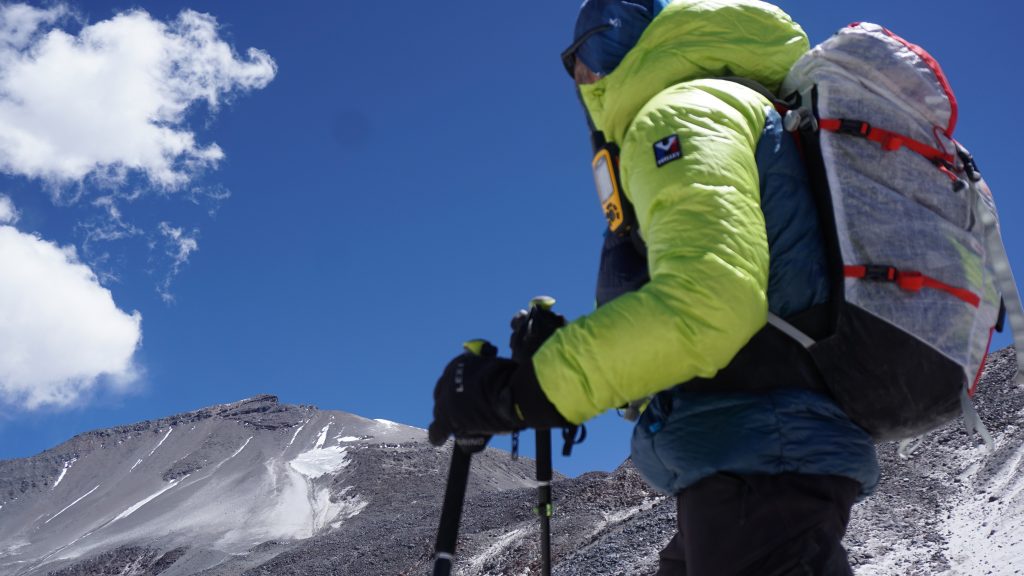 Abbiamo utilizzato lo zaino in qualsiasi situazione, sia pieno sia mezzo vuoto. Nonostante il peso molto contenuto lo zaino è ergonomico e ha una discreta imbottitura sullo schienale, sugli spallacci e sugli appoggi sui fianchi. Anche durante l’avvicinamento al campo Atacama, a 5.240m, durante il quale lo zaino era molto carico di attrezzatura legata anche all’esterno e molto pesante, ho riscontrato buone sensazioni di vestibilità e una buona stabilità generale. I nastri di compressione laterale e il sistema di chiusura superiore permettono di regolare a piacimento il volume disponibile che può essere aumentato da 45lt a 55lt nella parte superiore grazie alla regolazione a soffietto. La zip verticale permette l’accesso frontale al corpo principale dello zaino e risulta molto comoda per raggiungere materiali riposti nella parte inferiore. Il tessuto in Fibra Dyneema ad alta resistenza risulta durevole oltre che estremamente leggero. Il colore bianco/trasparente del tessuto permette un’ottima visuale dei contenuti interni che si riconoscono abbastanza facilmente anche dall’esterno a zaino chiuso. Il cappuccio può essere rimosso completamente. È fornito di due porta piccozze, porta sci laterale, porta corda, asole porta materiale interne, fischietto sul cinturino pettorale, una tasca laterale sul cinturone ventrale.
