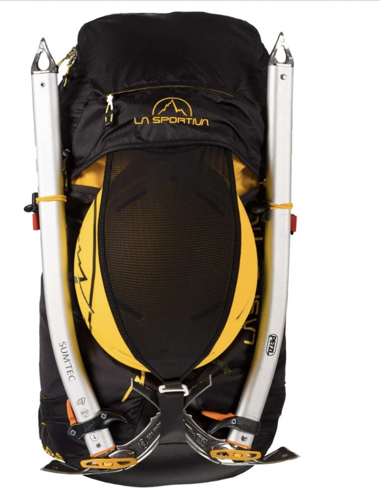 Il sacco è dotato di porta piccozze, porta sci laterale, ed è compatibile con vari sistemi di idratazione. Una taschina nella parte bassa della patella nasconde il porta casco in rete dotato di gancio metallico che permette di fissarlo alla parte sommitale dello zaino. Sotto a questa zip ve ne è una seconda, che permette di accedere ad un altro comodo scomparto che arriva fino in fondo allo zaino.