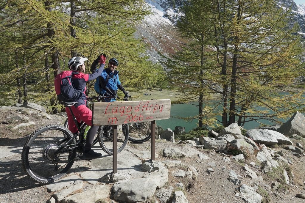 Giro in EMTB su strada poderale dal Colle San Carlo al Lago d’Arpy e ritorno. Tratti pedalati su asfalto sulla strada secondaria dalla frazione Pont Serrand proseguendo in direzione Col des Chavannes. Discesa su single track. Sentiero “P – Mulino” nel comprensorio di La Thuile.