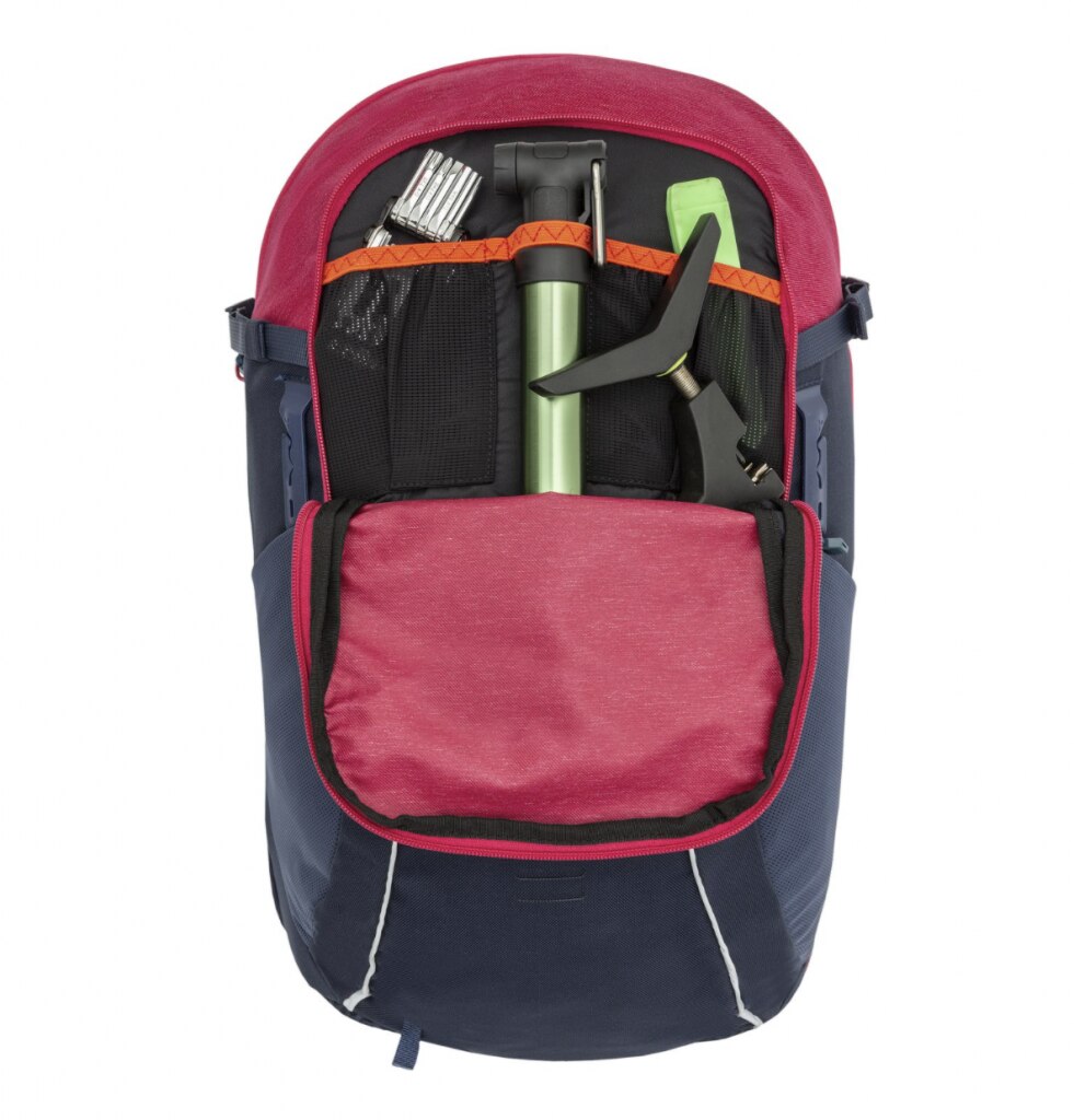 Lo zaino è diviso in tre grandi tasche principali, quella più interna (lato schienale) è predisposta per inserire una sacca idrica, la tasca centrale è la più spaziosa e al suo interno troviamo una piccola pochette removibile, quella più esterna è ben suddivisa in tanti piccoli scomparti chiusi da cerniere per i pezzi di ricambio. Esternamente troviamo le due tasche laterali in rete profonde che hanno l’elastico ben saldo: tutto quello che va tenuto a portata di mano non rischia di scappare fuori. Appena dietro la tasca laterale sinistra troviamo un’altra piccola tasca con cerniera con l’interno scamosciato. Un altro taschino in rete e con cerniera si trova sulla cintura in vita. All’esterno si può comodamente agganciare il casco e sullo spallaccio destro si trova un elastico dove poter agganciare gli occhiali. Sul fondo dello zaino troviamo la tasca contenente il rain cover, molto utile nelle giornate di pioggia.